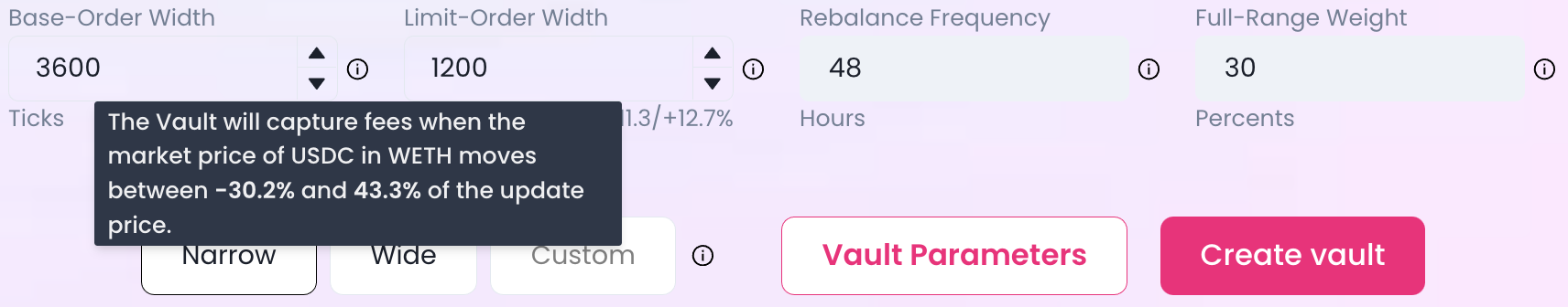 The default values can be changed in the fields above, by pressing Vault Parameters, or in [Edit Vault ](https://learn.charm.fi/charm/manage-liquidity/user-guides/walkthroughs/edit-vault)after a vault have been created.