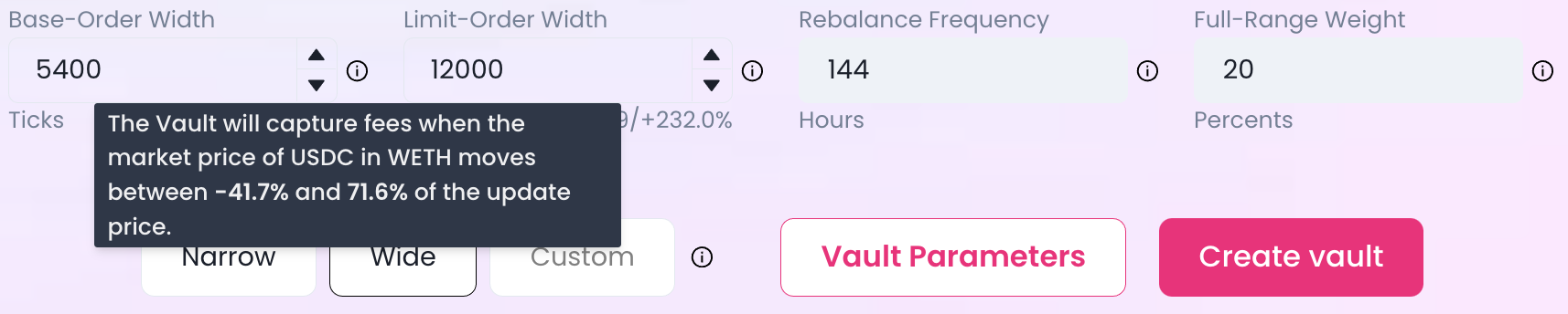 The default values for Wide-Range Strategy are chosen from the [live track record](https://alpha.charm.fi/) of Alpha Vaults v2.